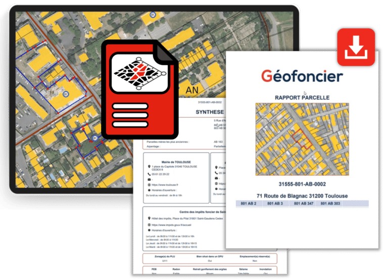 Générez en quelques clics des rapports sur plusieurs parcelles, d'une quarantaine de pages incluant 6 grandes thématiques (Cadastre, Urbanisme, Environnement, Copropriété, Historique cadastral, Ventes) issues de 12 sources d'informations officielles : cadastre.gouv.fr, Géoportail de l'urbanisme, Géorisques, DGFiP, etc.